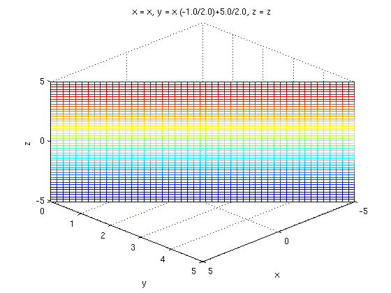 As another example suppose we wish to plot 2*x+4*y=10. We solve for y=(10-2*x)/4 and then we do the following. Notice that z is still there even though it's not part of the equation. In this case we have -5<=x<=5 and -5<=z<=5: