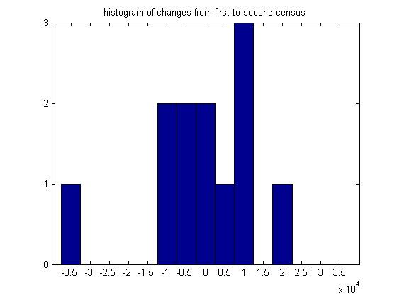 Note that most of the data is close to the diagonal, i.e., there is strong correlation between the two counts, but that there are some "outliers" far from the diagonal. We can see this better if we plot a table of changes from the first census to the second census, i.e., of the population increases/decreases during the 38 years in the desert. Here is a bar graph of these changes:
