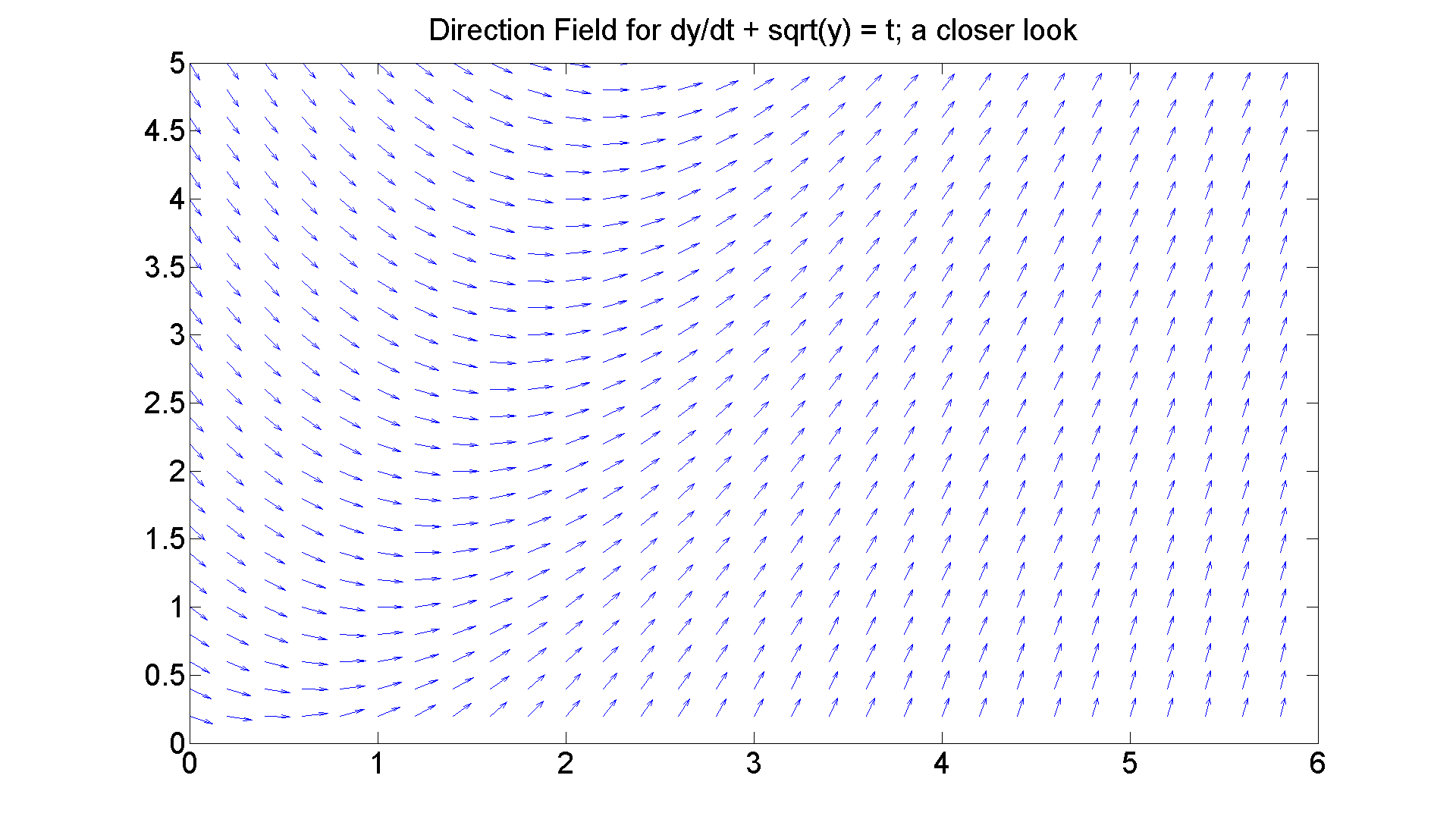 figure; set(gcf, 'Position', [1 1 1920 1420]) [T, Y] = meshgrid(0:0.2:5, 0.2:0.2:3); S = -sqrt(Y) + T; L = sqrt(1 + S.^2); quiver(T, Y, 1./L, S./L, 0.5), axis([0 5, 0 3]) title 'Direction Field for dy/dt + sqrt(y) = t' set(get(gca, 'Title'),'Fontsize', 25) set(gca,'XTickLabel',get(gca, 'XTickLabel'),'FontSize',25) % Gee it looks sort of similar to the first case. You have % to look closely to see that the line y = t -1 is not % really a solution. Let's refine the parameters a little % to see that better.