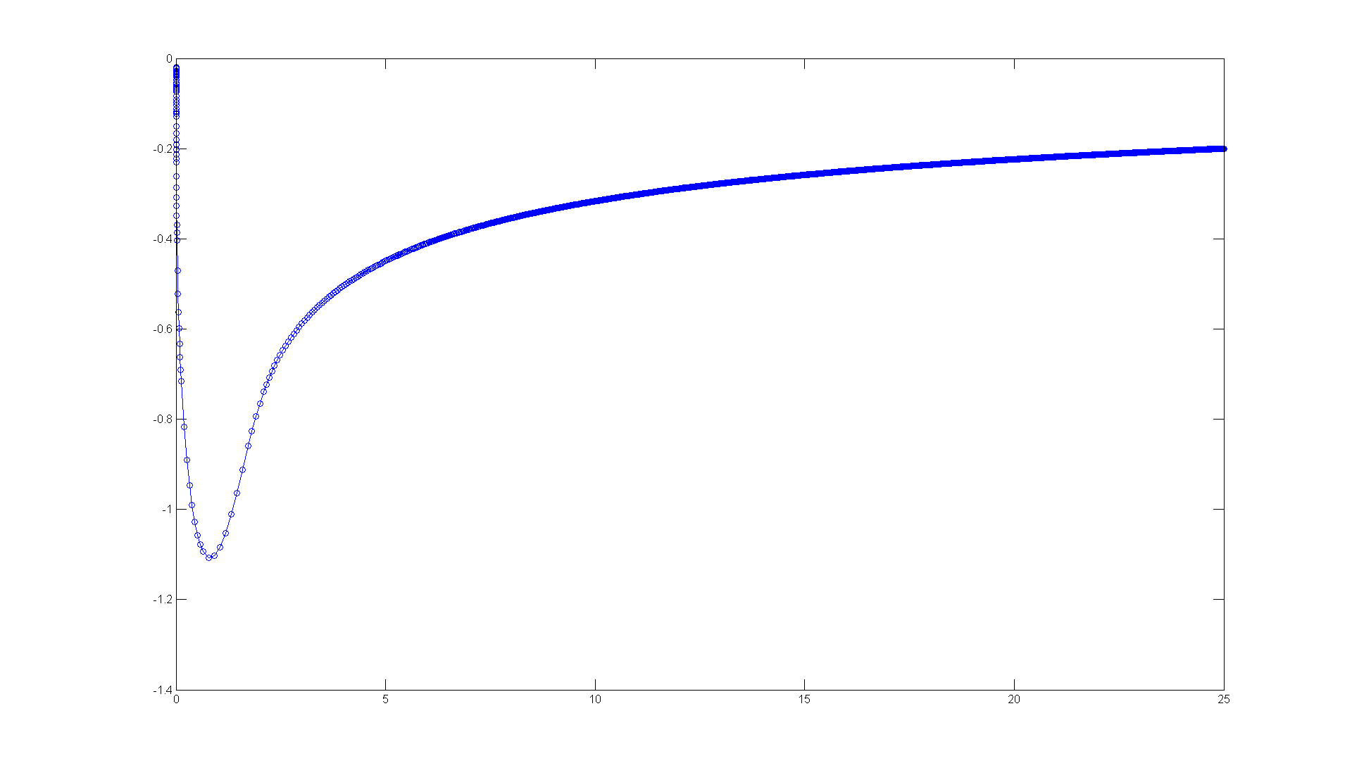 h = @(t, y) -1./y.^2 + t figure; set(gcf, 'Position', [1 1 1920 1420]) ode45(h, [0 25], -0.02) % The sharp turn is consisten with the % direction field. But it's not clear that the asymptote % is the t-axis. Can you explain from the differential % equation why that must be so? % y' + 1/y^2 = t % Now for more % solution curves superimposed on the direction field.