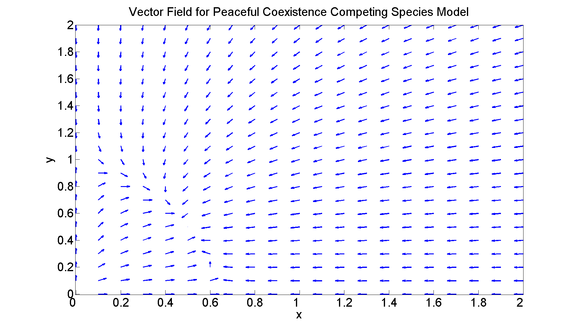 figure; set(gcf, 'Position', [1 1 1920 1120]) [X, Y] = meshgrid(0:0.1:2, 0:0.1:2); U = X.*(2 - 3.*X - Y); V = Y.*(1 - X - Y); L = sqrt(U.^2 + V.^2); quiver(X, Y, U./L, V./L, 0.3, 'LineWidth', 2) axis tight xlabel ('x', 'FontSize',25) ylabel ('y', 'FontSize',25) title ('Vector Field for Peaceful Coexistence Competing Species Model', 'FontSize',25) set(gca,'XTickLabel',get(gca, 'XTickLabel'),'FontSize',25) % Notice I refined the quiver parameters (as I did in some of the % above graphs) a little to improve the picture. But it's a little % hard to read from the graph what the exact equilibrium % points are. So let's have Matlab compute them for us.