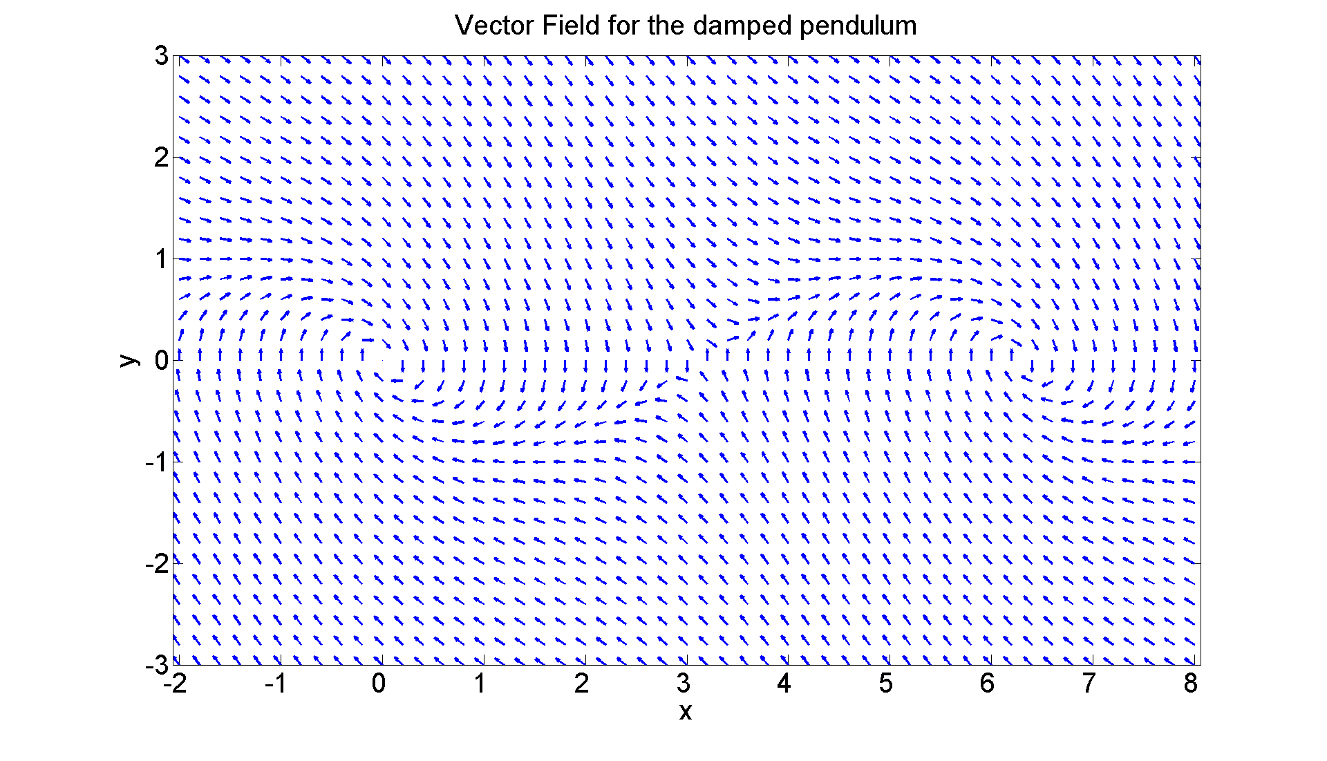 figure; set(gcf, 'Position', [1 1 1920 1120]) [X, Y] = meshgrid(-2:0.2:8, -3:0.2:3); U = Y; V = -sin(X) - Y; L = sqrt(U.^2 + V.^2); quiver(X, Y, U./L, V./L, 0.4, 'LineWidth', 2) axis equal tight xlabel ('x', 'FontSize',25) ylabel ('y', 'FontSize',25) title ('Vector Field for the damped pendulum', 'FontSize',25) set(gca,'XTickLabel',get(gca, 'XTickLabel'),'FontSize',25)