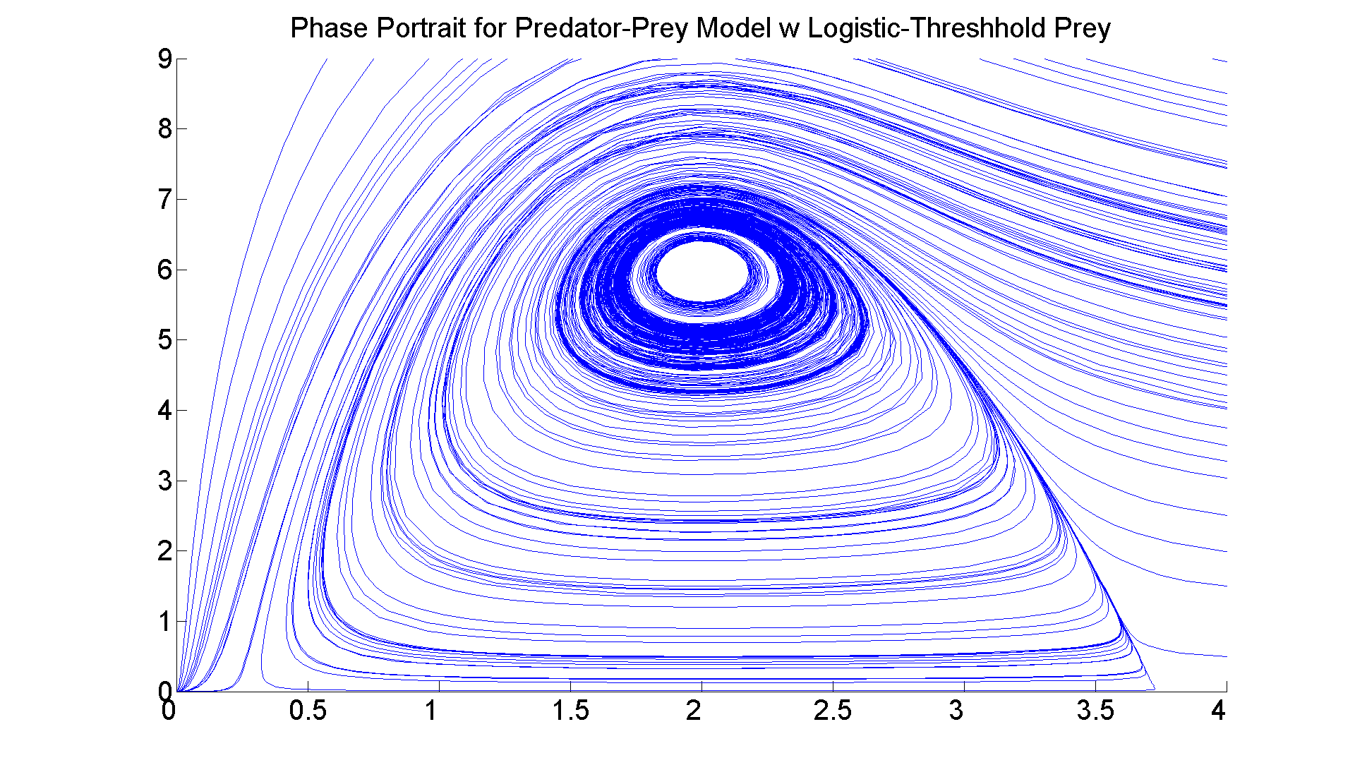 warning off all f = @(t, x) [x(1)*(-1 + 4.*x(1) - 0.5.*x(2) - x(1)^2); x(2)*(x(1) - 2)]; figure; set(gcf, 'Position', [1 1 1920 1420]) axes; hold on for a = 0.5:0.5:4 for b = 0.5:9 [t, xa] =ode45(f, [0 20], [a, b]); plot(xa(:,1),xa(:,2)) [t, xa] = ode45(f, [0 -10], [a, b]); plot(xa(:,1),xa(:,2)) end end axis([0 4 0 9]) title ('Phase Portrait for Predator-Prey Model w Logistic-Threshhold Prey', 'FontSize', 25) set(gca,'XTickLabel',get(gca, 'XTickLabel'),'FontSize',25)