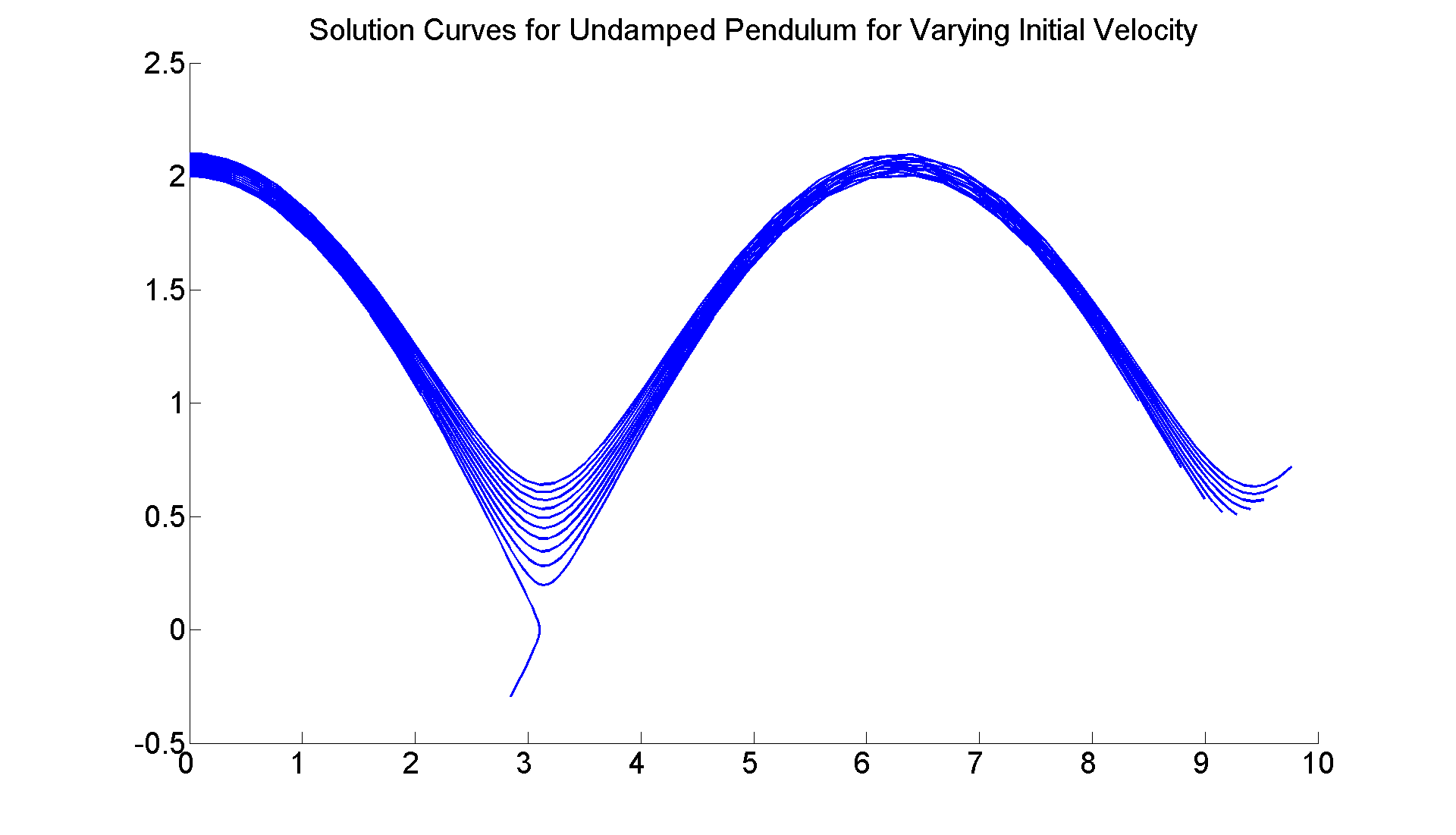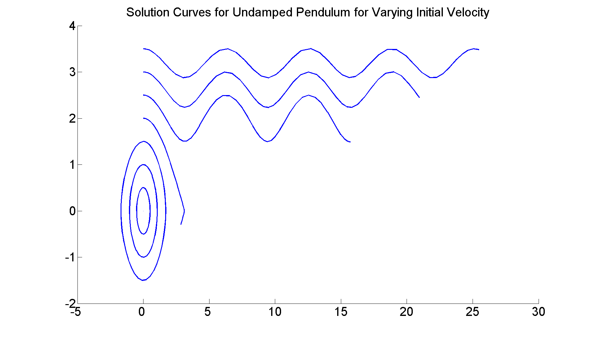 figure; set(gcf, 'Position', [1 1 1920 1420]) axes; hold on f = @(t, x) [x(2);-sin(x(1))]; for c=0:1/2:7/2 [t, xa] =ode45(f, [0 8], [0, c]); plot(xa(:,1),xa(:,2), 'LineWidth', 2) end title ('Solution Curves for Undamped Pendulum for Varying Initial Velocity', 'FontSize', 25) set(gca,'XTickLabel',get(gca, 'XTickLabel'),'FontSize',25) % So the actual critical value is between 2 and 2.5. You can refine % the search further by choosing initial velocities more finely, % e.g., c =2: 0.1:2.5, and so on.
