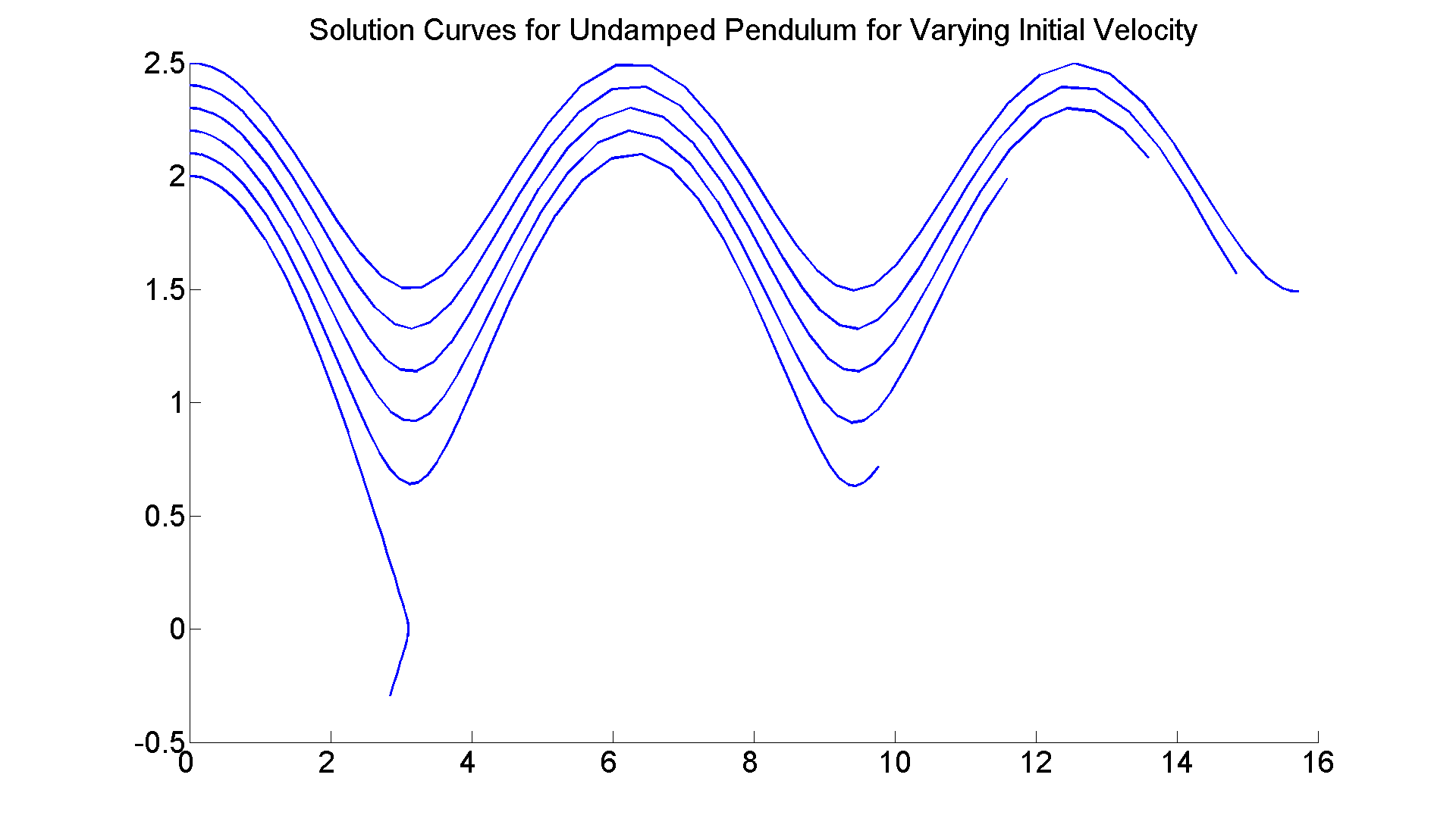 figure; set(gcf, 'Position', [1 1 1920 1420]) axes; hold on f = @(t, x) [x(2);-sin(x(1))]; for c=2:0.1:2.5 [t, xa] =ode45(f, [0 8], [0, c]); plot(xa(:,1),xa(:,2), 'LineWidth', 2) end title ('Solution Curves for Undamped Pendulum for Varying Initial Velocity', 'FontSize', 25) set(gca,'XTickLabel',get(gca, 'XTickLabel'),'FontSize',25)