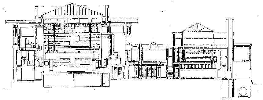 Section showing main space (on left), foyer (with doors) and fellowship hall (on right)