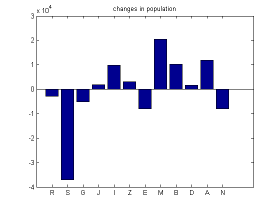 Note that most of the data is close to the diagonal, i.e., there is strong correlation between the two counts, but that there are some "outliers" far from the diagonal. We can see this better if we plot a table of changes from the first census to the second census, i.e., of the population increases/decreases during the 38 years in the desert. Here is a bar graph of these changes: