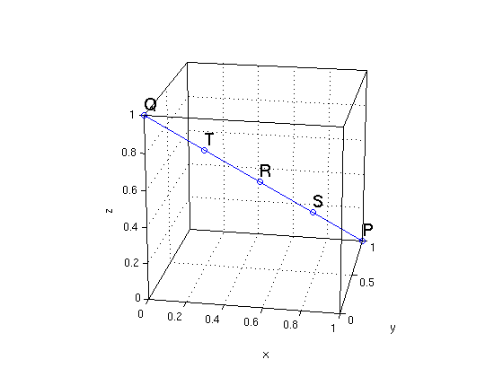 R = P + .5*a % midpoint of P and Q, same as (P+Q)/2 S = P + .25*a T = P + .75*a plotpts([P;Q],'o-') % plot line from P to Q, mark endpoints with circles hold on % add the following stuff to this plot plotpts([R;S;T],'o') % plot points R,S,T, mark with circles texts(P,'P'); texts(Q,'Q'); % label points texts(R,'R'); texts(S,'S'); texts(T,'T'); hold off % we're done with this plot nice3d % make plot look nice % you can rotate plot with mouse in Matlab window view(10,20) % pick nice angle to look at plot