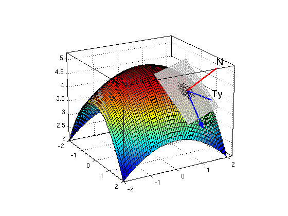 syms x y real % define x,y as real symbolic values f = 5-x^2/2-y^2/4 fx = diff(f,x) % partial derivative with respect to x fy = diff(f,y) % partial derivative with respect to y x0 = 1; y0 = 1; f0 = subs(f,{x,y},{x0,y0}) % substitute (x0,y0) for (x,y) fx0 = subs(fx,{x,y},{x0,y0}) fy0 = subs(fy,{x,y},{x0,y0}) Tx = [1,0,fx0] % tangent vector in x-direction Ty = [0,1,fy0] % tangent vector in y-direction N = cross(Tx,Ty) % normal vector for tangent plane ezsurf(f,[-2 2 -2 2]); hold on P = [x0,y0,f0]; % the point on the graph arrow3(P,Tx); texts(P+Tx,'Tx') arrow3(P,Ty); texts(P+Ty,'Ty') arrow3(P,N,'r'); texts(P+N,'N') plane(P,N) hold off; nice3d; view(60,20)
