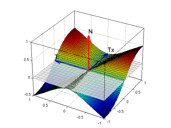 f = x*y^2/(x^2+y^2); ezsurf(f,[-1 1 -1 1]) % plot graph for x=-1...1, y=-1...1 x0 = 0; y0 = 0; f0 = 0 % we define f(0,0)=0 fx0 = 0 % since f(x,0) = 0 fy0 = 0 % since f(0,y) = 0 Tx = [1,0,fx0] % tangent vector in x-direction Ty = [0,1,fy0] % tangent vector in y-direction N = cross(Tx,Ty) % normal vector for tangent plane ezsurf(f,[-1 1 -1 1]); hold on nice3d P = [x0,y0,f0]; arrow3(P,Tx); texts(P+Tx,'Tx') arrow3(P,Ty); texts(P+Ty,'Ty') arrow3(P,N); texts(P+N,'N') plane(P,N) hold off; nice3d; view(-60,30)