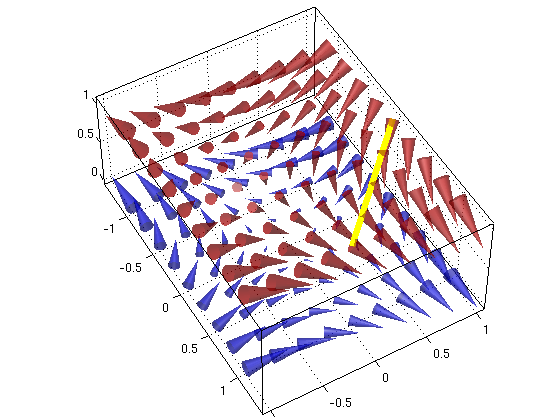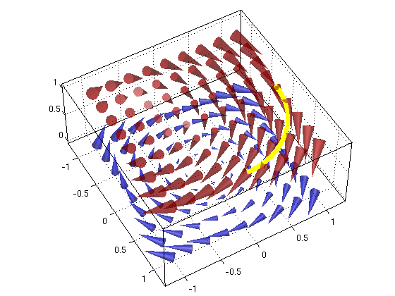 syms x y z F = [y,-x,-z]; % given vector field G = curl(F) % note: Matlab gives curl as column vectorfield3(F,-1:.5:1,-1:.5:1,-1:1) view(60,20)