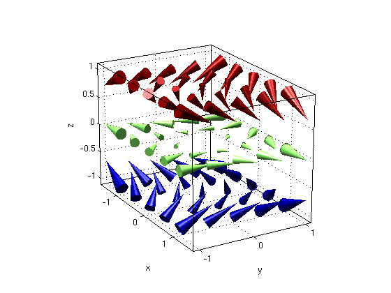 syms x y z F = [x+y,x-y,-z]; % given vector field G = curl(F) % note: Matlab gives curl as column vectorfield3(F,-1:.5:1,-1:.5:1,-1:1) view(60,20)