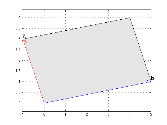 a = [-1,3]; b = [5,1]; Asq = dot(a,a)*dot(b,b)-dot(a,b)^2 % A^2 area1 = sqrt(Asq) determinant = det([a;b]) % note that vectors a,b have negative orientation area2 = abs(determinant) or = [0,0]; gray = [.9 .9 .9]; % RGB color gray fillpts([or;a;a+b;b],gray); hold on arrow(or,a,'r'); arrow(or,b,'b') texts(a,'a'); texts(b,'b') hold off; axis equal; grid on