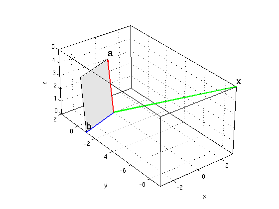 a = [1,2,3]; b = [-3,-1,0]; Asq = dot(a,a)*dot(b,b)-dot(a,b)^2 % A^2 area1 = sqrt(Asq) x = cross(a,b) % cross product area2 = norm(x) or = [0,0,0]; fillpts([or;a;a+b;b],gray); hold on arrow3(or,a,'r'); arrow3(or,b,'b'); arrow3(or,x,'g') texts(a,'a'); texts(b,'b'); texts(x,'x') hold off; nice3d