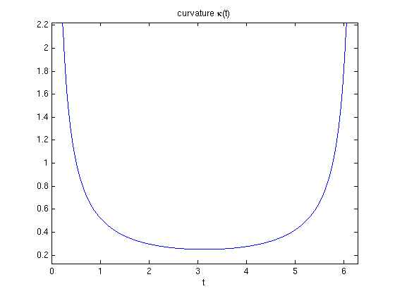 syms t real Pi = sym('pi'); r = [t-sin(t), 1-cos(t), 0]; v = diff(r,t) a = diff(v,t) kappa = simplify( norm(cross(a,v))/norm(v)^3 ) % formula with cross product ezplot(kappa,[0,2*pi]) % Plot kappa title('curvature \kappa(t)') % Note: kappa becomes infinite for t=0, 2*pi