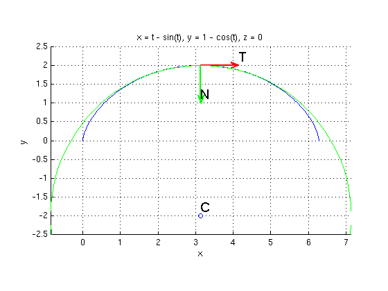 t0 = Pi; % Try also t0 = Pi/2 r0 = subs(r,t,t0); % Plug in t=t0 v0 = subs(v,t,t0); a0 = subs(a,t,t0); apar = dot(a0,v0)/dot(v0,v0)*v0; % decompose a0 = apar + aorth aorth = simplify(a0 - apar); kappa0 = subs(kappa,t,t0); % curvature, same as norm(aorth)/dot(v0,v0) T = v0/norm(v0) % unit tangent vector T N = aorth/norm(aorth) % normal vector N B = cross(T,N); % binormal vector R = 1/kappa0 % radius of osculating circle C = r0 + R*N % center of osculating circle ezplot3(r(1),r(2),r(3),[0,2*pi]); hold on % plot curve for t=0...2*pi arrow3(r0,T,'r'); texts(r0+T,'T') arrow3(r0,N,'g'); texts(r0+N,'N') plotpts(C,'o'); texts(C,'C') circle3(C,B,R,'g') % plot osculating circle (green) hold off; axis equal ylim([-2.5 2.5]) % show y between -2.5, 2.5 view(0,90); % look at xy-plane