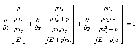 In this example we use CentPack's two-dimensional second order fully-discrete formulation, centpack_2d_FD2, to evolve the solution of Euler's equations of gas dynamics